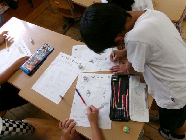 子供たちは、1年生が喜んでくれるオリジナルのおもちゃを考えて設計図を書いていました。