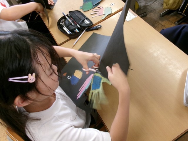「黒画用紙を切り取り、鳥の形をつくろう」をめあてに制作に取り組みました。