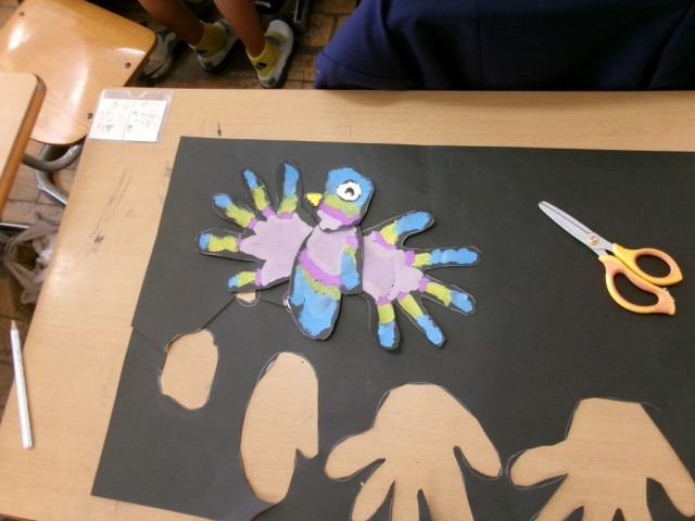 黒画用紙には、前時までに3種類の手の形を写し取り、きれいに色を塗っています。