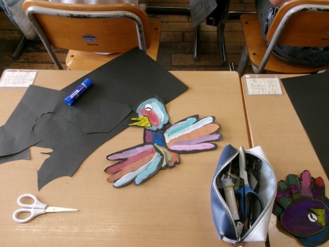 それぞれの形を切り取った後、うまく組み合わせて自分だけの鳥をつくりました。カラフルでかわいらしい鳥ができていました。