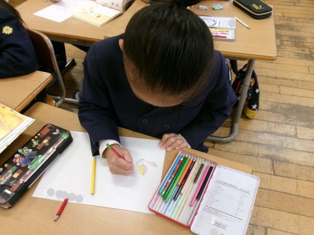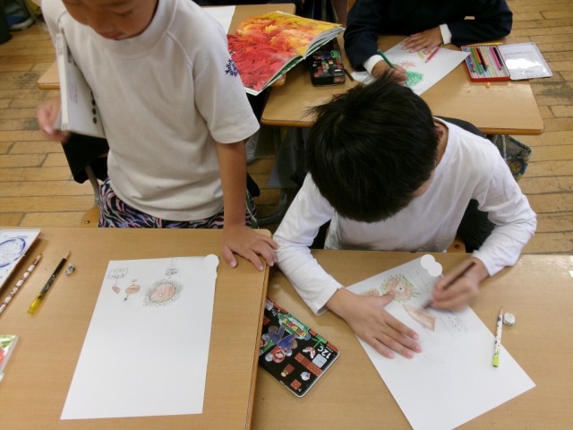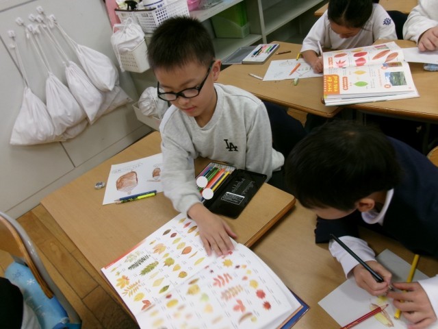 2年生では、「あきのようすをかこう~葉っぱやどんぐり~」をめあてに絵を描きました。