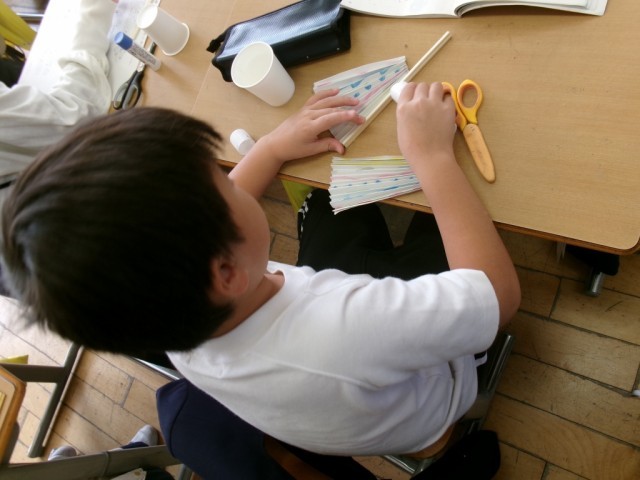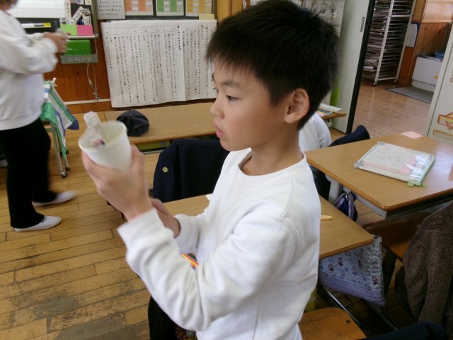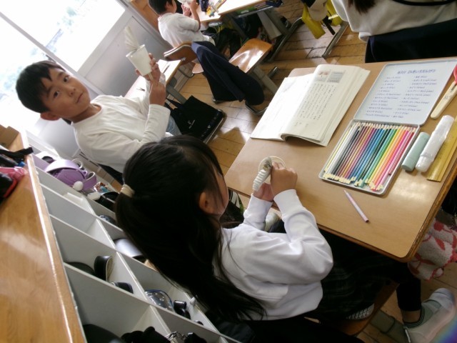 教科書をよく読むと作り方が分かります。子供たちは文章をよく読んで紙コップ花火を制作しました。