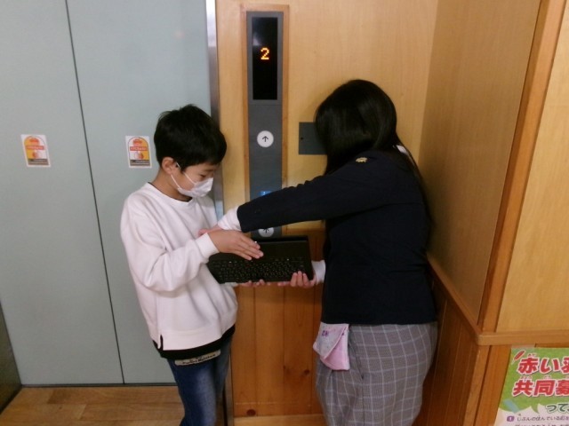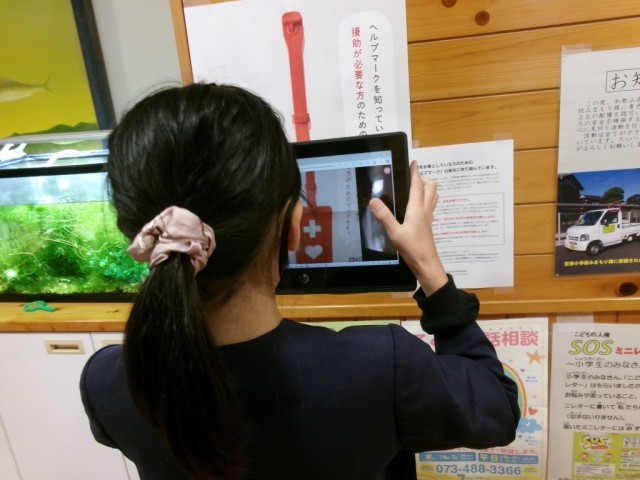 校内にもバリアフリーに関する設備や掲示物などがあります。グループで校内を周り、見つけた個所をタブレットで撮影しました。