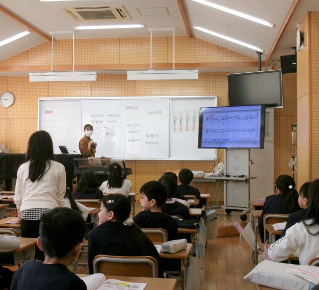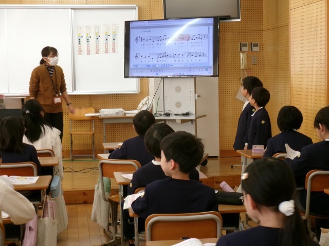 曲に合わせて体を動かしながら歌いました。上手に身体表現できている児童が、前でお手本を見せてくれました。
