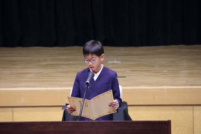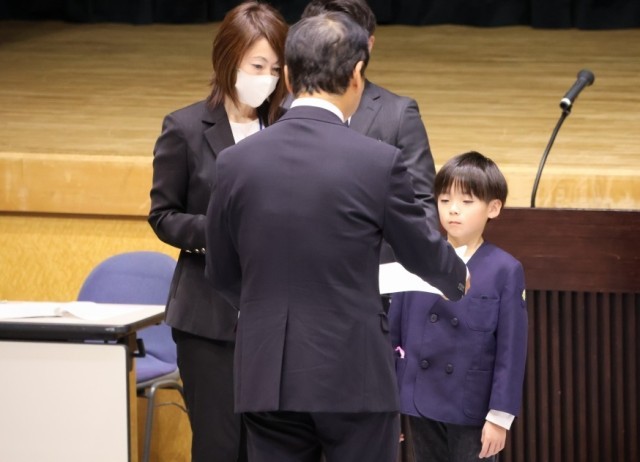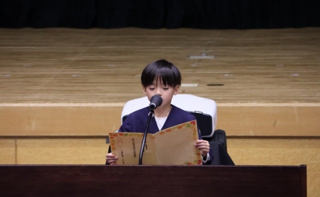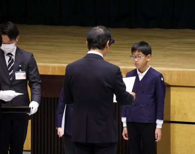 本校4年生の黒山さんの作文「ぼくが守るそらの未来」が最優秀賞、同じく上田さんの作文「戦争をなくす第一歩」が優秀賞に選ばれ、中阪雅則町長から表彰状を授与していただきました。