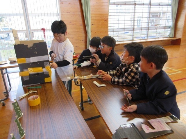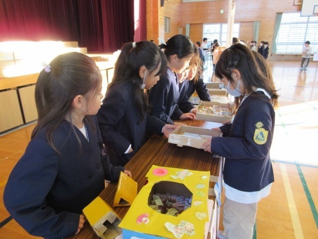 2年生児童が自作のおもちゃをつくり「おもちゃランド」を開きました。「おもちゃランド」に招待された1年生の子供たちは大喜びです。