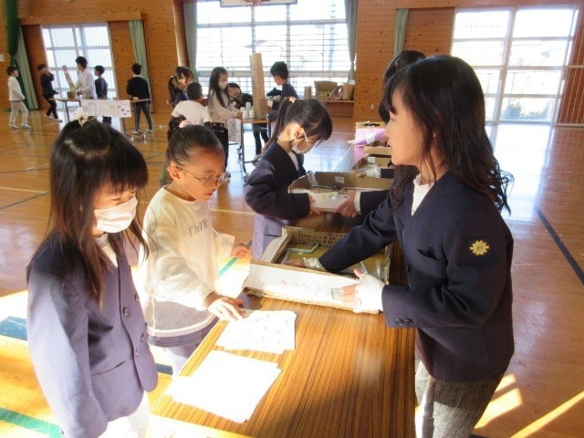 それぞれのブースで2年生の児童の説明を聞き、1年生の児童は楽しく遊びました。