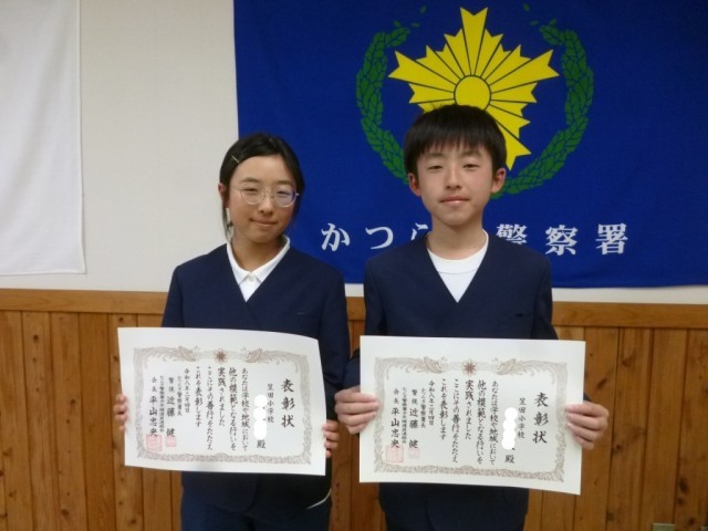 本日、かつらぎ警察暑において、善行少年表彰式が行われ、本校からは6年生児童2名が表彰されました。