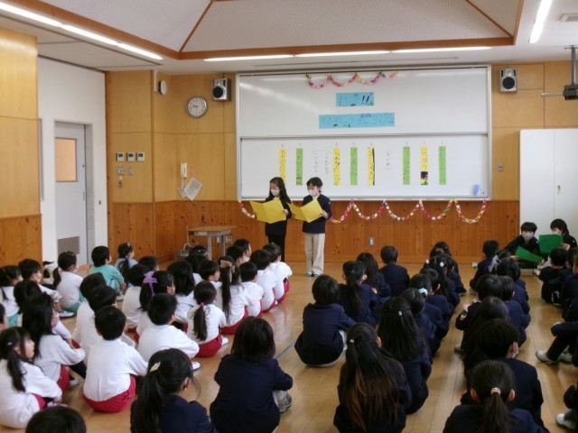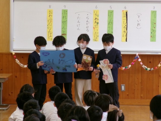 1年生は、今までの学習でできるようになったことを発表したり、いろいろな授業や休み時間の様子を分かりやすく紹介したりしました。