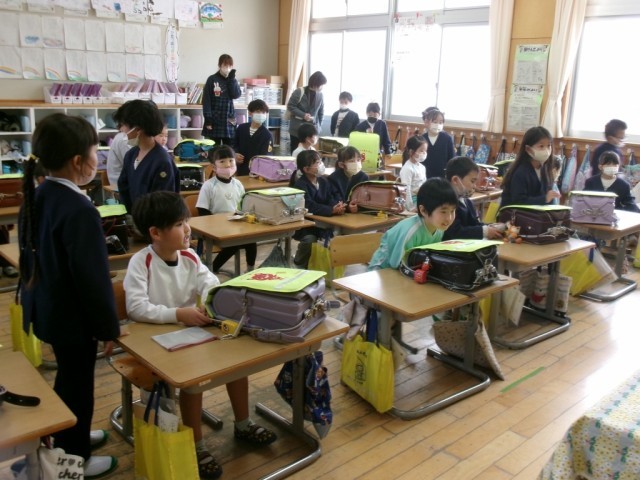 また1年生と園児がペアやグループになり、一緒にゲームを楽しんだり、ランドセルを背負わせてあげて校内を案内したりしました。