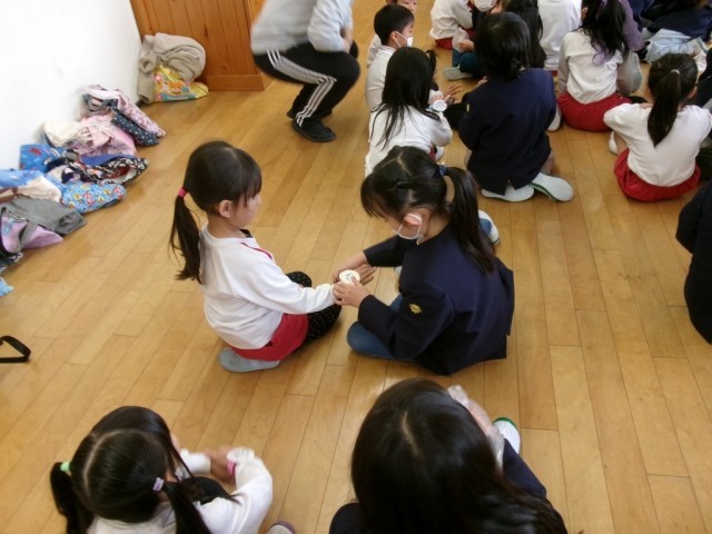 最後に、1年生からのプレゼント「ウォッチ」を園児の腕につけてあげて、「ぴょんぴょんガエル」で遊びました。