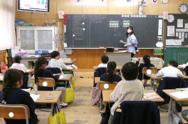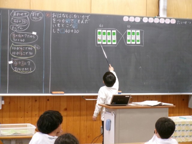 子供たちは、40は10の束が4つ、30は10の束が3つと考えて、「4+3」の計算を使って解く方法を発表しました。