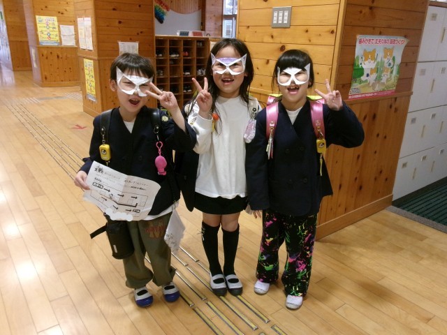 早速、仮面をつけていた1年生の子供たち。とても嬉しそうでした。さあ、仮面をつけた君もあいさつレンジャーの仲間入りです!