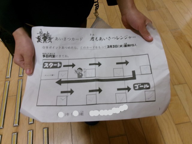 代表委員会が行っているあいさつ運動の取り組みで、「あいさつカード」にポイントを8個集めた児童は、あいさつレンジャーから仮面をもらいました。