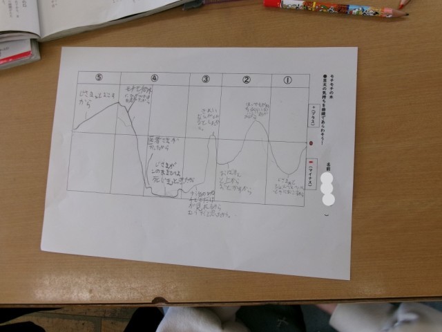 「モチモチの木」の学習をすすめるなかで、豆太の気持ちの変化を曲線であらわし、なぜプラスの気持ちかマイナスの気持ちか、それぞれ理由も書き込みました。