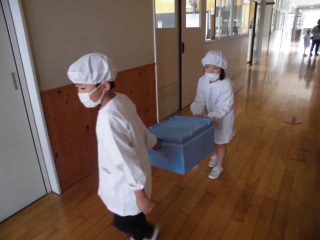 今日の給食はカレーライスです。重い食缶や食器もがんばって運びます。