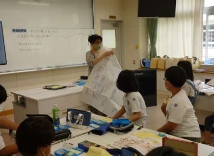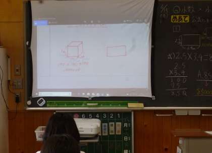 黒板を写すだけでなく、自分が後でよく分かるように工夫してポイントを書いています。前に映された友達の算数ノートを参考に、自分のノート作りをしていきましょう。(2枚目)