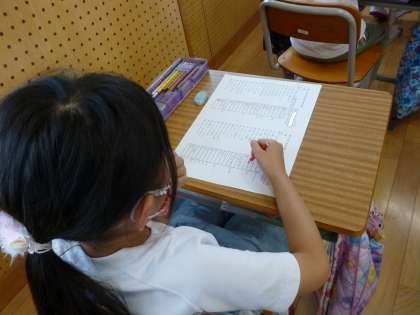 2年生では、初めての漢字の博士試験に向けての学習をがんばっています。練習問題で間違えた漢字や読み方が分からなかった漢字をやり直して、覚え直しています。試験に向けてみんな真剣に取り組んでいます。