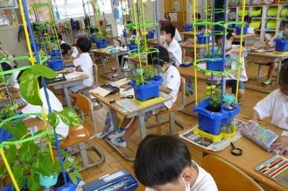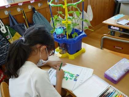 アサガオのつるはさらに伸びてきました。もうつぼみもできています。何色の花が咲くのかな。
