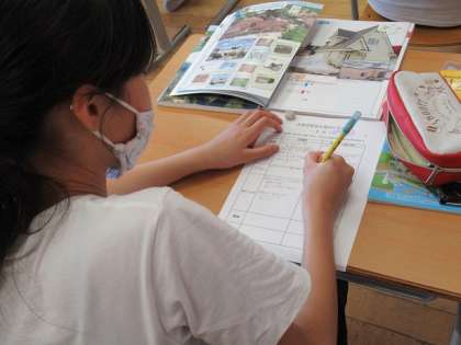 あたたかい土地と寒い土地のくらしについて学習しています。家のつくりや産業など、ワークシートにまとめています。(2枚目、3枚目)