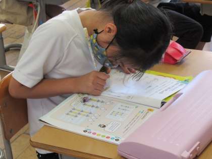 教科書に記載されている音符を見て、階名を書き込んでいます。(3枚目)