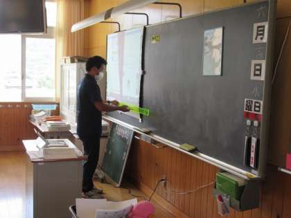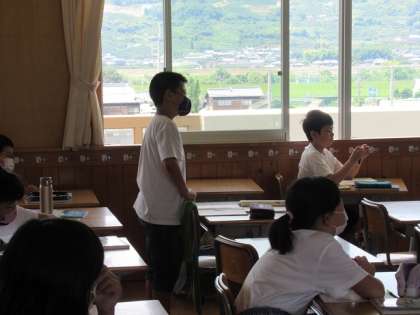 小数のわり算について学習しています。問題文をよく読んで、どのように解き進めていけばよいかをみんなで考えています。(1枚目、2枚目)