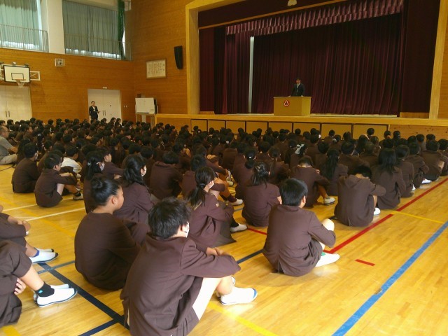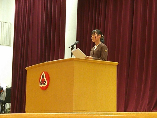 服装を整え、校長先生の話をじっと聞いていました。表彰式では「平和な社会を考える作文」で最優秀賞になった中前寧々さんがその作文を披露してくれました。