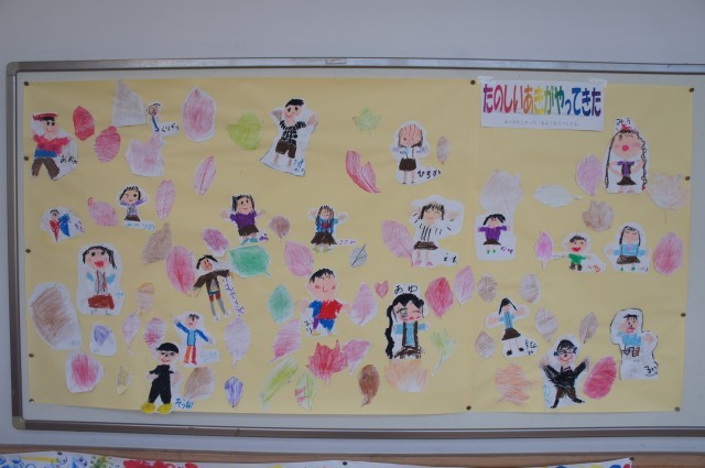 1階には1年生が秋探しで見つけてきたはっぱをこすって描いた作品が展示されていました。