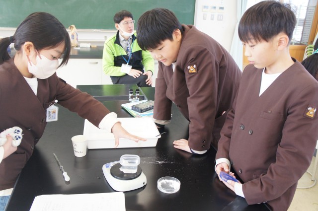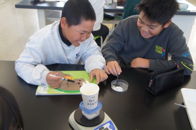 理科の授業では食塩水を作り、水に溶ける食塩の行方を調べていました。