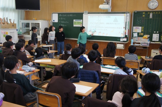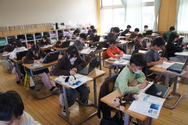3年生は総合の発表、4年生はテスト(なので写真はありません)とタブレット学習をしていました。