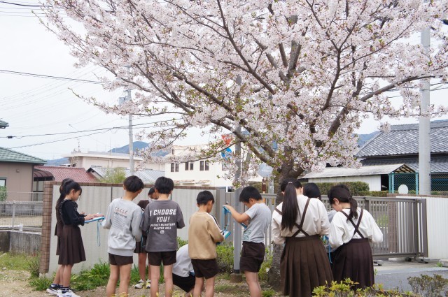心配だった正門の桜も散らずに咲き誇っていました。今日は4年生が理科の時間に観察を行っていました。
