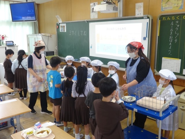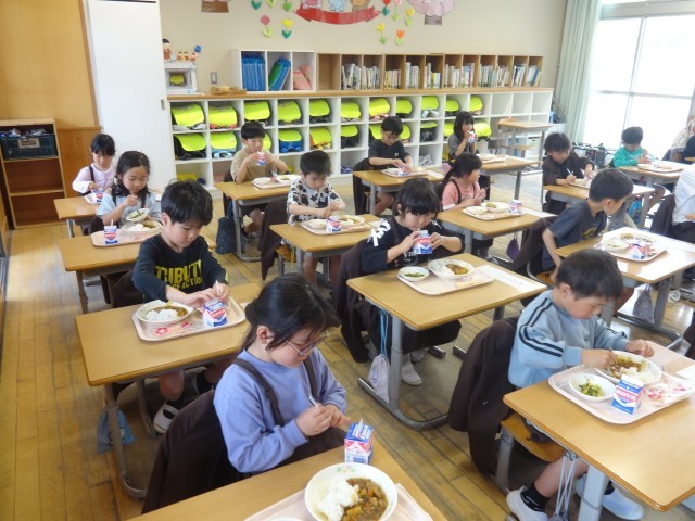 入学して1週間。1年生は今日から給食が始まりました。子供たちは給食時のルールをしっかりと守って活動することができていました。今日のメニューはカレーです。おいしそうに食べていました。