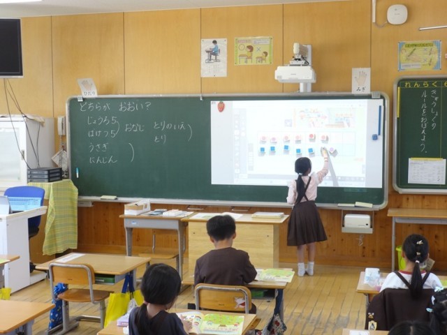 算数科「どちらが おおい?」の学習です。数図ブロックを用いて、数の多い、少ないを比べました。先生の話をよく聞いて活動できていました。