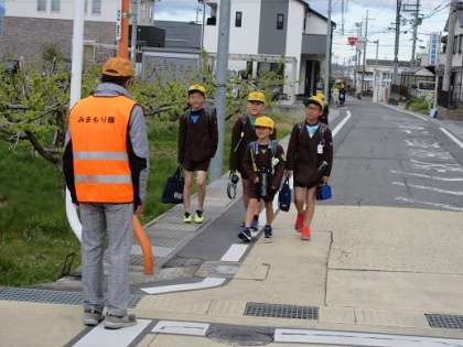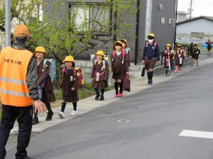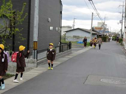 登校の様子です。高学年の児童に手をひかれ、元気よく登校してきました。また、保護者の方も途中まで一緒です。見守り隊の皆様、今年度もよろしくお願いいたします。