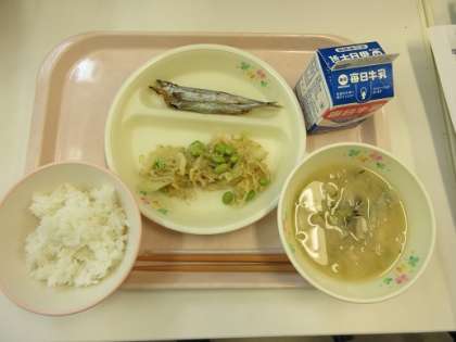 【献立】ごはん、焼きシシャモ、キャベツとささみのごまあえ、具だくさん味噌汁、牛乳