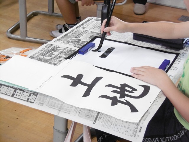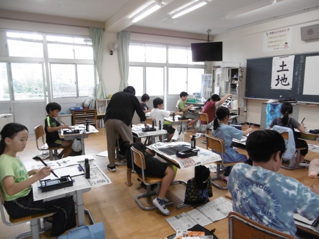 土地という文字を書きました。へんとつくりの大きさに気を付け、練習をしました。土はへんになると、大きさや形が少し変わることに気を付けました。