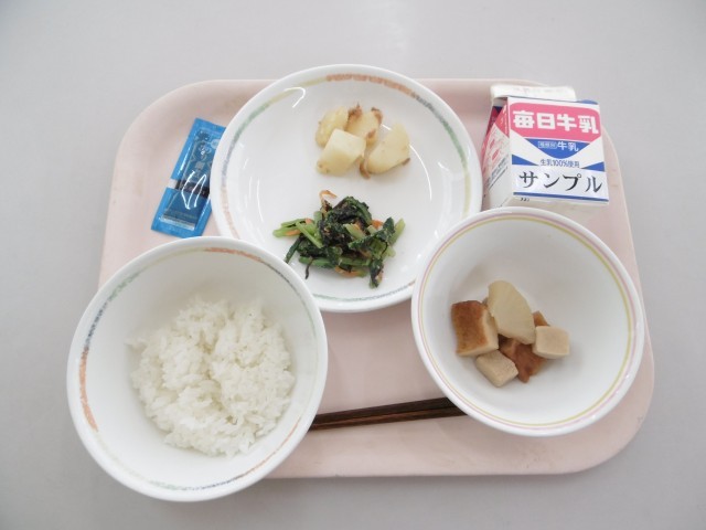 10月3日(金)の献立は、ご飯、牛乳、高野豆腐の煮物、小松菜のごまみそあえ、ツナじゃが、のり佃煮 です。