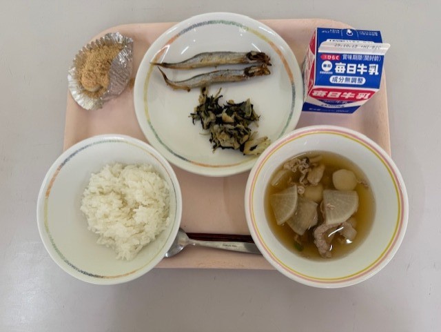 10月6日(月)の献立は、ごはん、牛乳、焼きししゃも、キャベツとみずなの炒めサラダ、お月見汁、月見団子 です。今日はお月見の献立です。