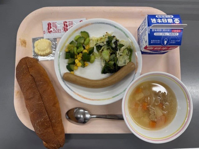 10月10日(金)の献立は、ホットドッグ、牛乳、きゅうりのコロコロサラダ、ABCスープ、型抜きチーズ です。