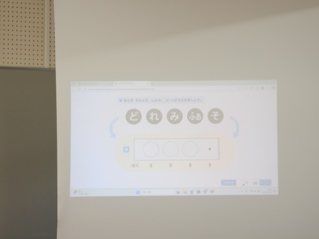 ドレミファソの中で、一人一人3つの音を選びました。鍵盤ハーモニカを演奏し、みんなで音をつなげました。1回目は、1年生から、2回目は2年生から順番を変えて演奏しました。