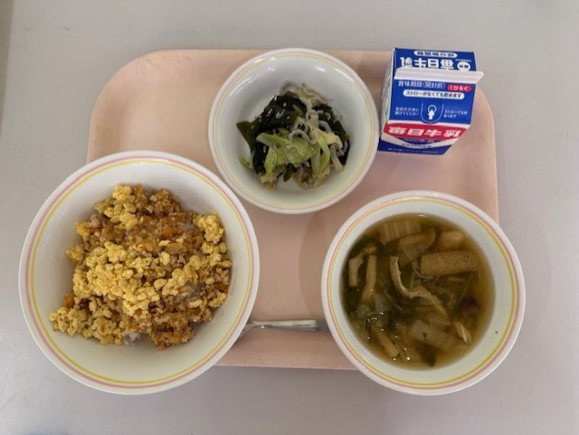 10月15日(水)の献立は、シャキシャキそぼろ丼、牛乳、じゃことわかめの酢の物、さつまいもと白菜のみそ汁 です。