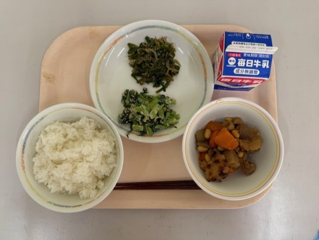 10月16日(木)の献立は、ごはん、牛乳、筑前煮、こまつなのごまマヨネーズサラダ、じゃこピーマン炒め です。