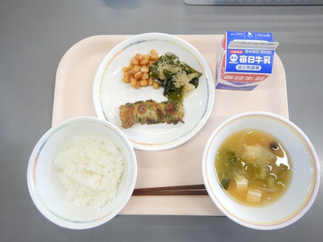 10月23日(木)の給食は、ごはん、牛乳、竹輪の磯辺揚げ、フライビーンズ、わかめとだいこんのあえもの、とうふとはくさいのみそ汁 です。