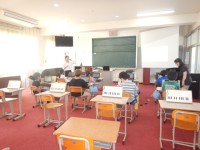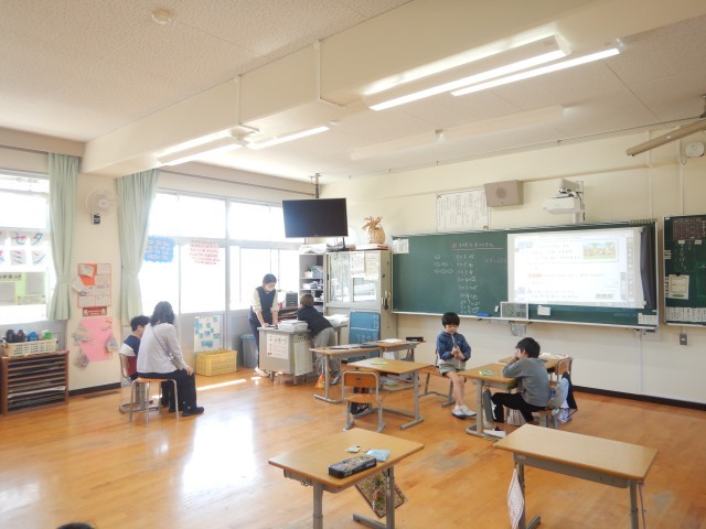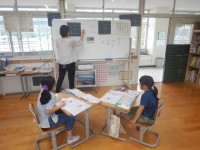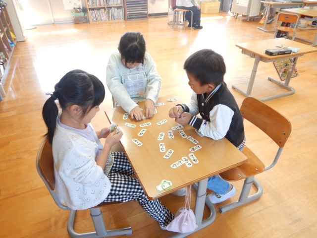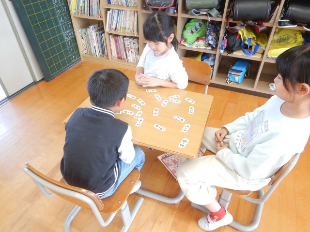 1年生は、答えが○〇になる計算の式カードを当てっこしながら、繰り上がりの計算を復習しました。2年生は、最近始まった九九を一生懸命覚えています。いつも先生や友達に九九を聞いてもらっています。