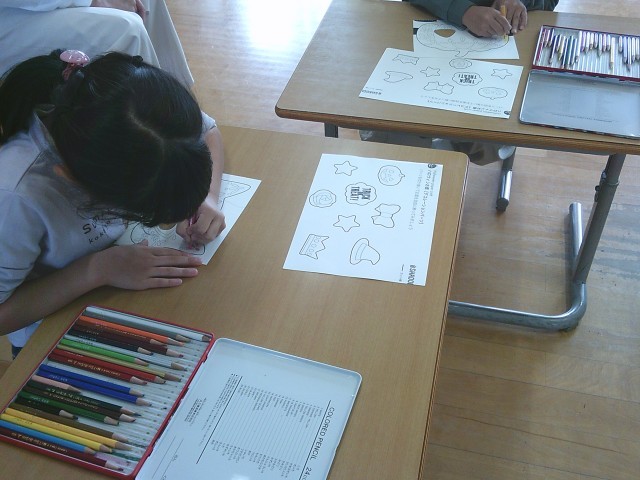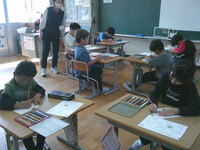 図工でハロウィンの仮面を作りました。自分の好きな仮面を選び色塗りをして完成させました。