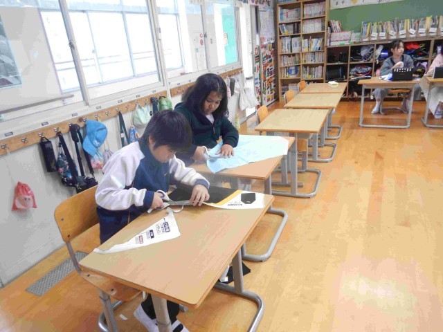 家庭科でエプロンを作っています。自分で選んだ布を裁ちばさみで、線にそって切りました。しつけをして、ミシンで縫っていきます。出来上がったら、調理実習で使う予定です。
