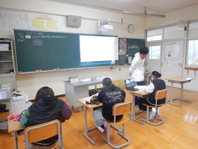 データの活用の学習をしています。ドットプロット図(ちらばりを表した図)を使って、データの分析をしました。