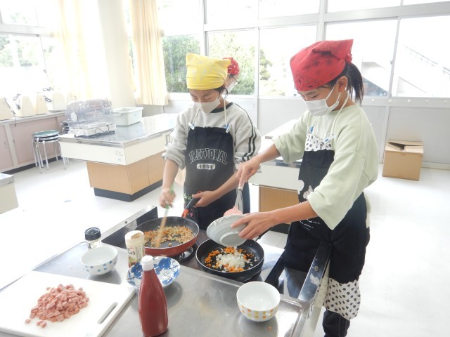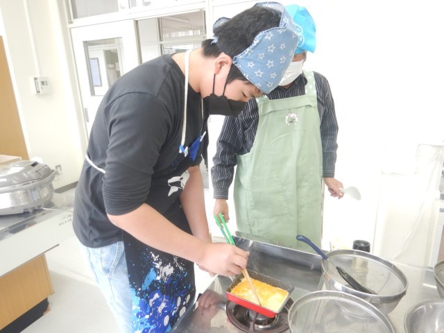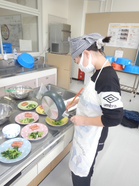 調理実習で、ウインナーと青菜のソテー、オムライス、スープを作りました。4人で役割分担しながら、3種類のお料理ができました。オムライスの卵は自分でそれぞれ焼きました。野菜たっぷりの献立で、とておいしくできました。