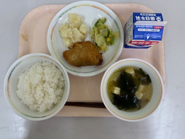 11月5日(水)の献立は、ごはん、牛乳、白身魚の梅風味揚げ、キャベツの中華風サラダ、粉ふきいも、わかめスープ です。