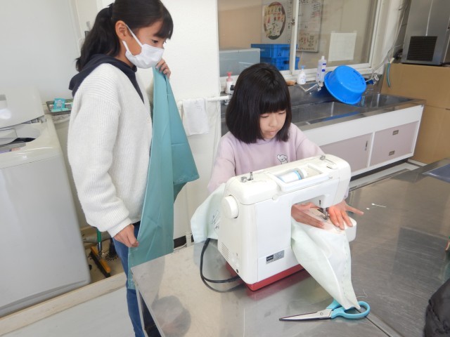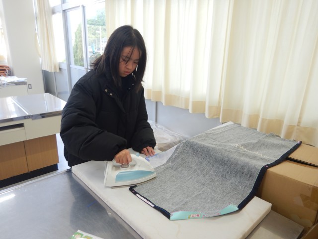 家庭科でエプロン作りをしています。アイロンで折り目を付け、ミシンを使って縫っています。